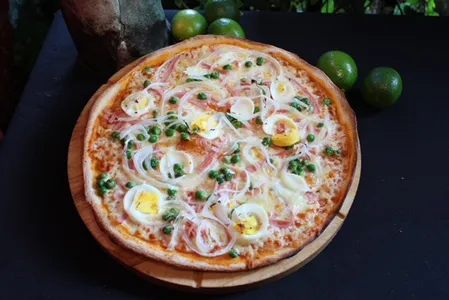 Salsa base, mozzarella, jamon, huevo rebanado, cebolla, arvejas, oregano